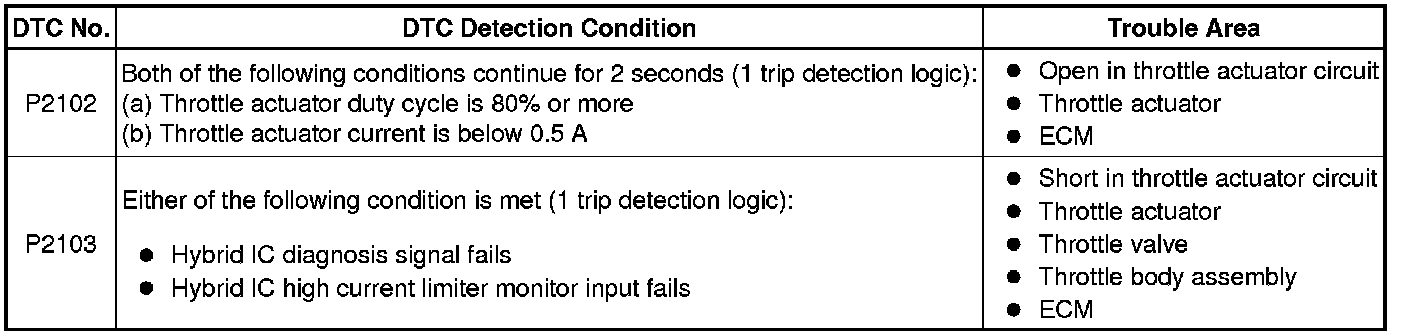 When either of these DTCs, as well as other DTCs relating to electronic throttle control system malfunctions is stored, the ECM enters fail-safe mode. During fail-safe mode, the ECM cuts the current to the throttle actuator, and the throttle valve is returned to a 5.5° throttle angle by the return spring. The ECM stops the engine and the vehicle can be driven using solely the hybrid system. If the accelerator pedal is depressed firmly and gently, the vehicle can be driven slowly.