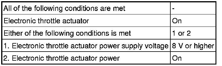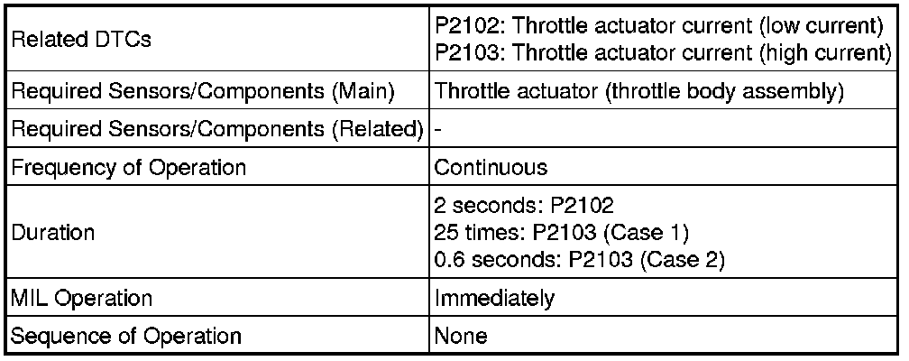 The ECM monitors the electrical current through the electronic actuator, and detects malfunctions and open circuits in the throttle actuator based on this value. If the current is outside the standard range, the ECM determines that there is a malfunction in the throttle actuator. In addition, if the throttle valve does not function properly (for example, stuck on), the ECM determines that there is a malfunction. The ECM then illuminates the MIL and stores a DTC.