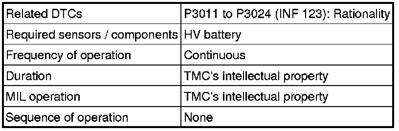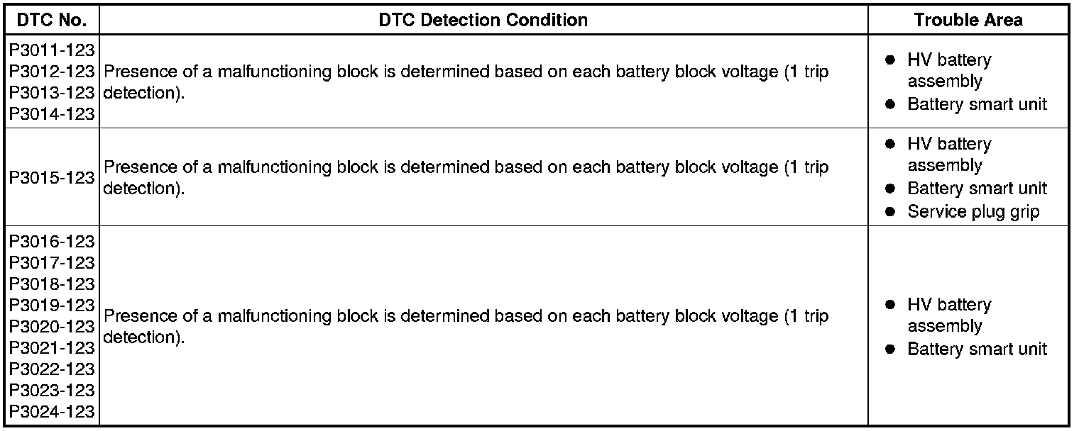 If there is an abnormal internal resistance or electromotive voltage in the battery blocks, the battery smart unit determines that a malfunction has occurred. When the malfunction detection condition is satisfied, the power management control ECU (HV CPU) will illuminate the MIL and set a DTC.