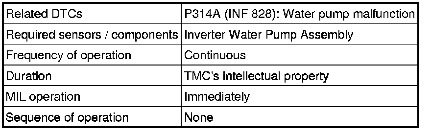 The power management control ECU (HV CPU) monitors speed of the inverter water pump assembly. If there is an abnormality in speed, the power management control ECU (HV CPU) will illuminate the MIL and set a DTC.