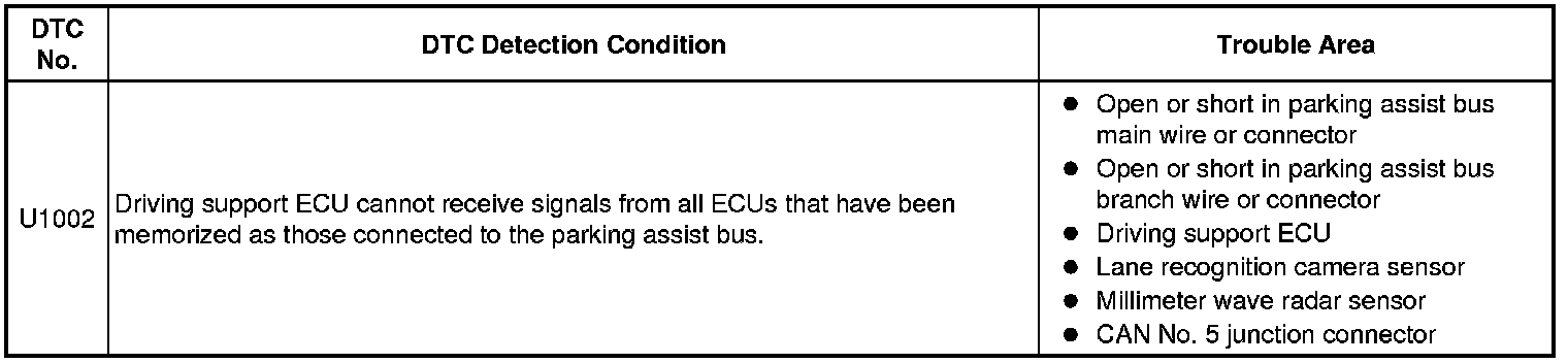 The driving support ECU will store this DTC when no signals can be received from the ECUs that have been memorized as those that are connected to the parking assist bus.