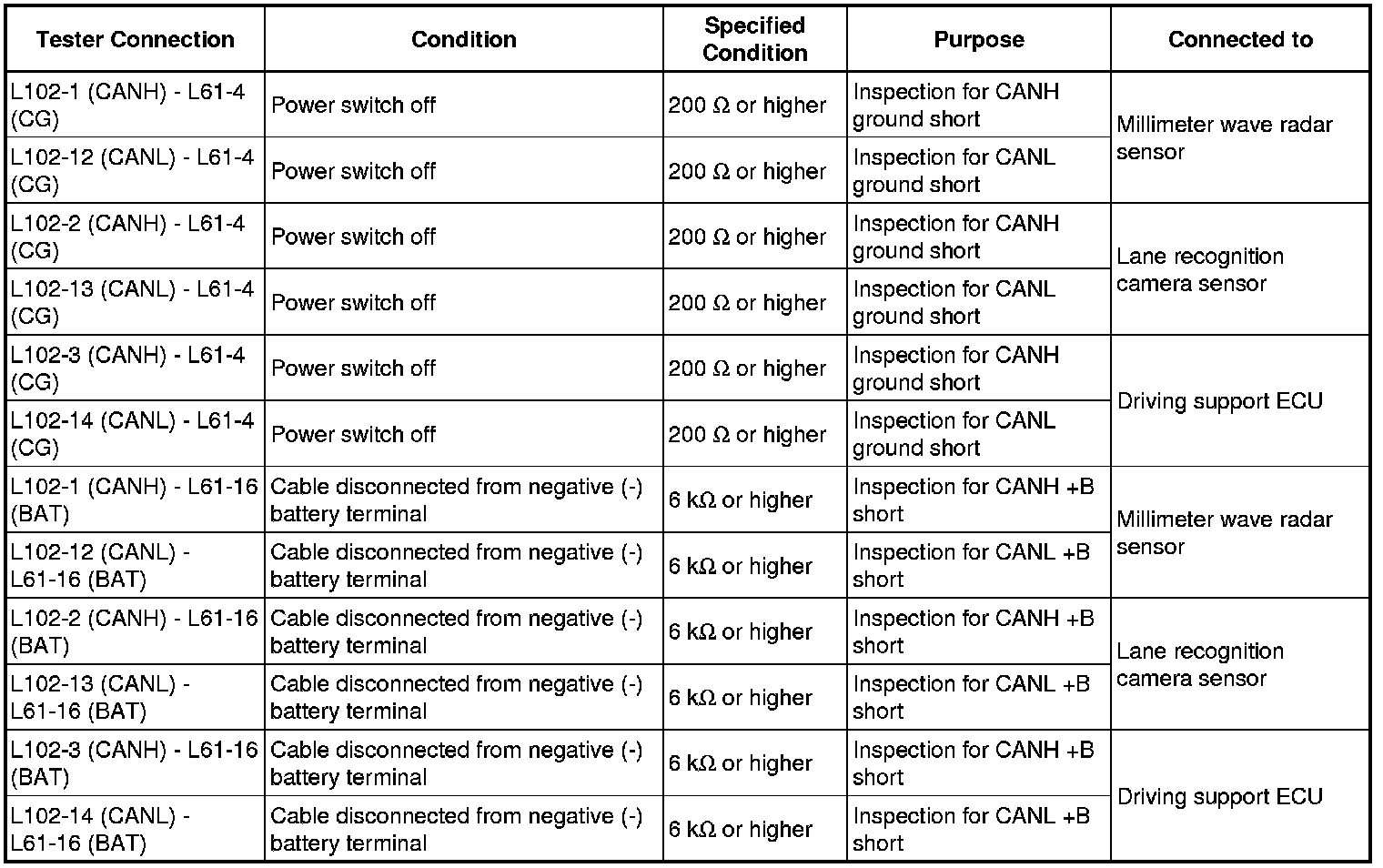 * Find the necessary inspection from the Purpose column that matches the result in the Result column from the Check CAN Bus Wire inspection.