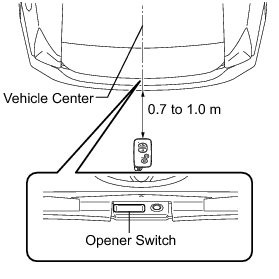 (2) Inspect the entry back door open operation detection area. Hold the key at the same height as the back door opener switch assembly (approximately 0.8 m (2.62 ft.)) aligning it with the center of the rear of the vehicle. Make sure that the direction of the key is as shown in the illustration. Check that when the key is brought within 0.7 to 1.0 m (2.30 to 3.28 ft.) of the vehicle, pushing the back door opener switch assembly (opener switch) opens the back door.