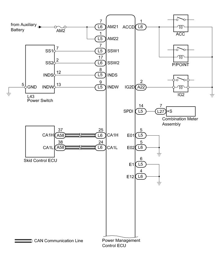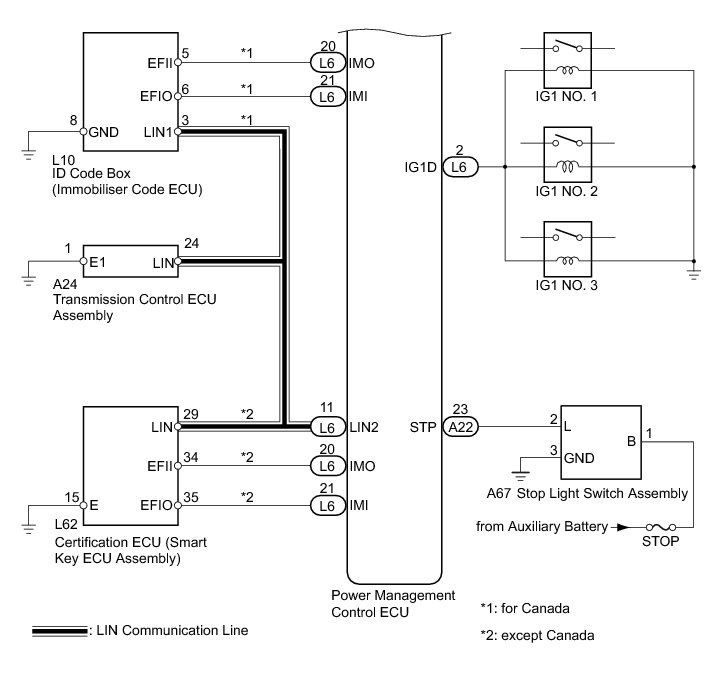 * When the power management control ECU is replaced with a new one and the cable from the negative (-) auxiliary battery terminal is connected, the power source mode becomes on (IG) mode. When the auxiliary battery is removed and reinstalled, power source mode that was selected when the auxiliary battery was removed is restored.