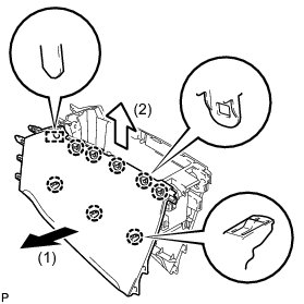 (a) Pull the No. 2 box side panel in the direction indicated by the arrow to disengage the 8 claws and guide, and remove the No. 2 box side panel as shown in the illustration.
