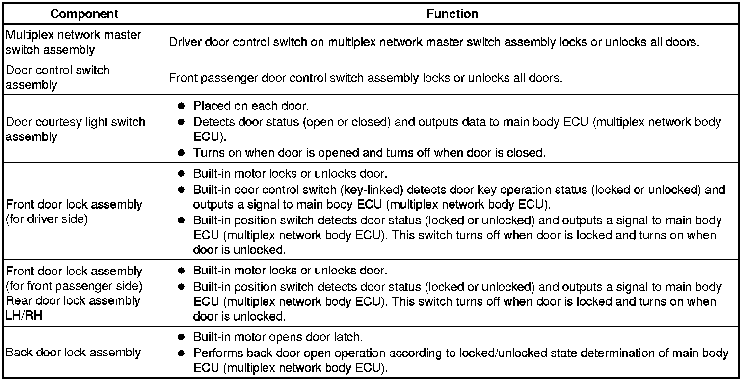 The driver and front passenger door control switches send lock/unlock request signals to the main body ECU (multiplex network body ECU). Then, the main body ECU (multiplex network body ECU) sends these request signals to the door lock motors in each door to lock/unlock all doors at once in response to the inputs.