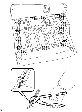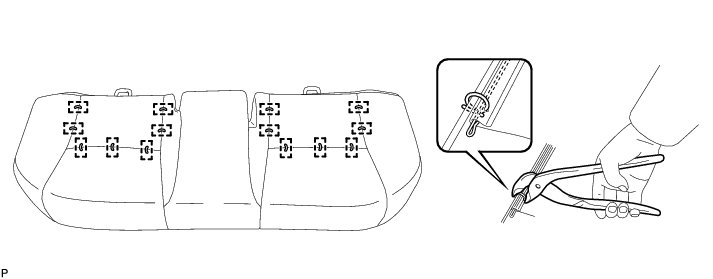 (a) Using hog ring pliers, install the bench type rear seat cushion cover to the bench type rear seat cushion pad with 14 new hog rings.