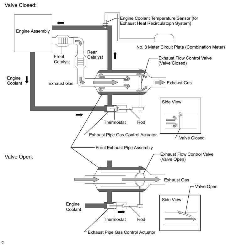 After the engine coolant temperature rises and the engine has warmed up, the heat of the coolant expands the thermostat and the exhaust pipe gas control actuator rod extends. This opens the exhaust flow control valve to switch to the normal exhaust gas path.