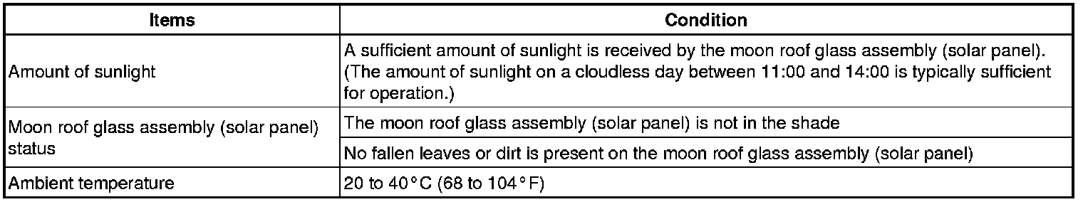 To ensure stable generation of voltage by the moon roof glass assembly (solar panel), make sure to park the vehicle in a location where the system operation conditions reference table are satisfied.