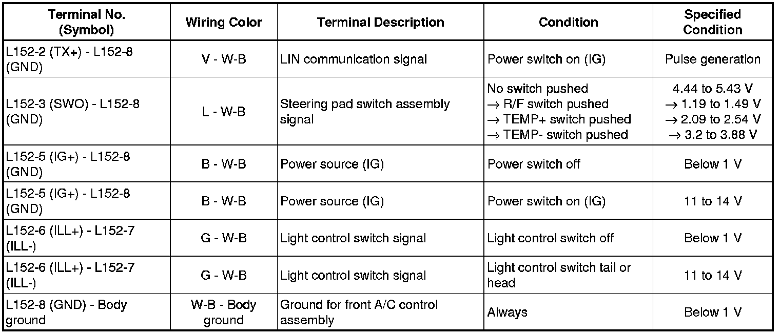 Check from the rear of the connector while it is connected to the A/C control assembly.