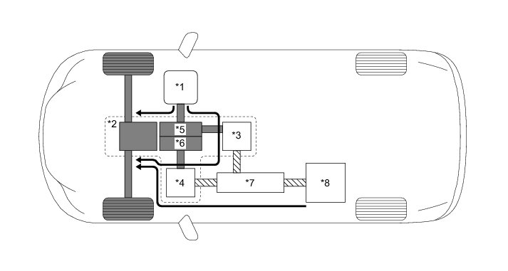 (1) When the vehicle is started off, the vehicle operates powered by MG2. If the required drive torque increases when running with MG2 only, MG1 is activated to start the engine.