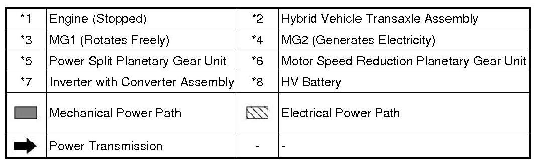 (1) While the vehicle is decelerated with the shift position in D, the engine is turned off and the motive force changes to zero. At this time, the wheels drive MG2, causing MG2 to operate as a generator, charging the HV battery. If the vehicle decelerates from a higher speed, the engine maintains a predetermined speed without stopping, in order to protect the planetary gears.