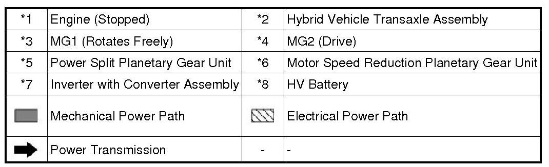 (1) When the vehicle is being driven in reverse, the required power is supplied by MG2. At this time, MG2 rotates in the opposite direction, the engine remains stopped, and MG1 rotates in the normal direction without generating electricity.