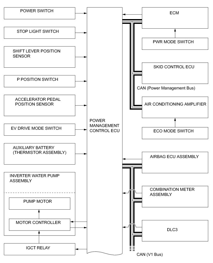 (2) The power management control ECU constantly monitors the engine coolant temperature, SOC, HV battery temperature and electrical load conditions. If any of the monitoring conditions fails to satisfy the requirements, and when the vehicle is in the READY-on state and the shift position is any positions other than N, the power management control ECU starts the engine.