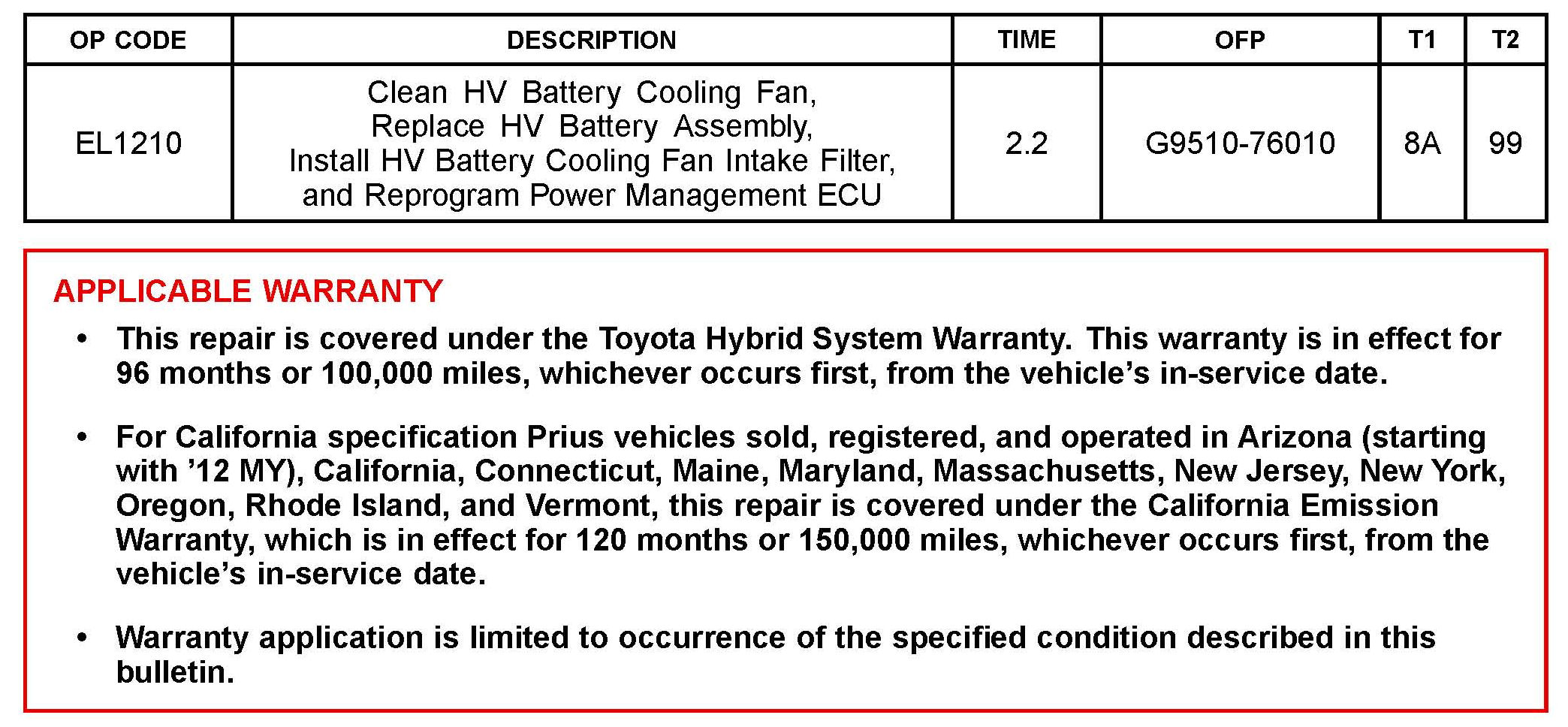 9. For severe usage vehicles, refer to Service Bulletin T-SB-0198-11, "HV Battery Cooling Fan Maintenance for Severe Usage Vehicles", for additional HV Battery Cooling Fan maintenance recommendations.