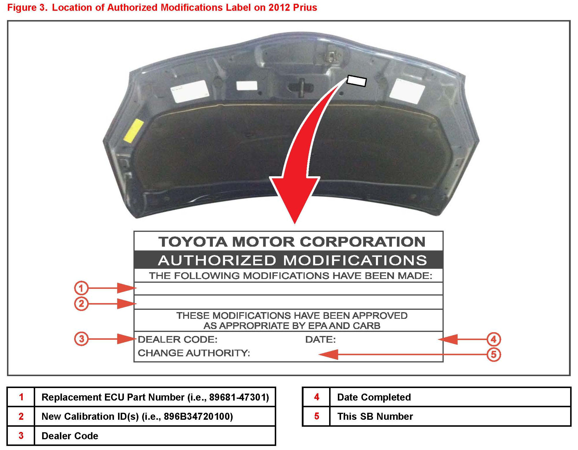 5. Check for the Authorized Modifications Label affixed to the vehicle in the location shown in Figure 3. Confirm if the Power Management ECU calibration has been updated. If the calibration ID listed is NOT the latest Power Management ECU calibration - go to step 6.
