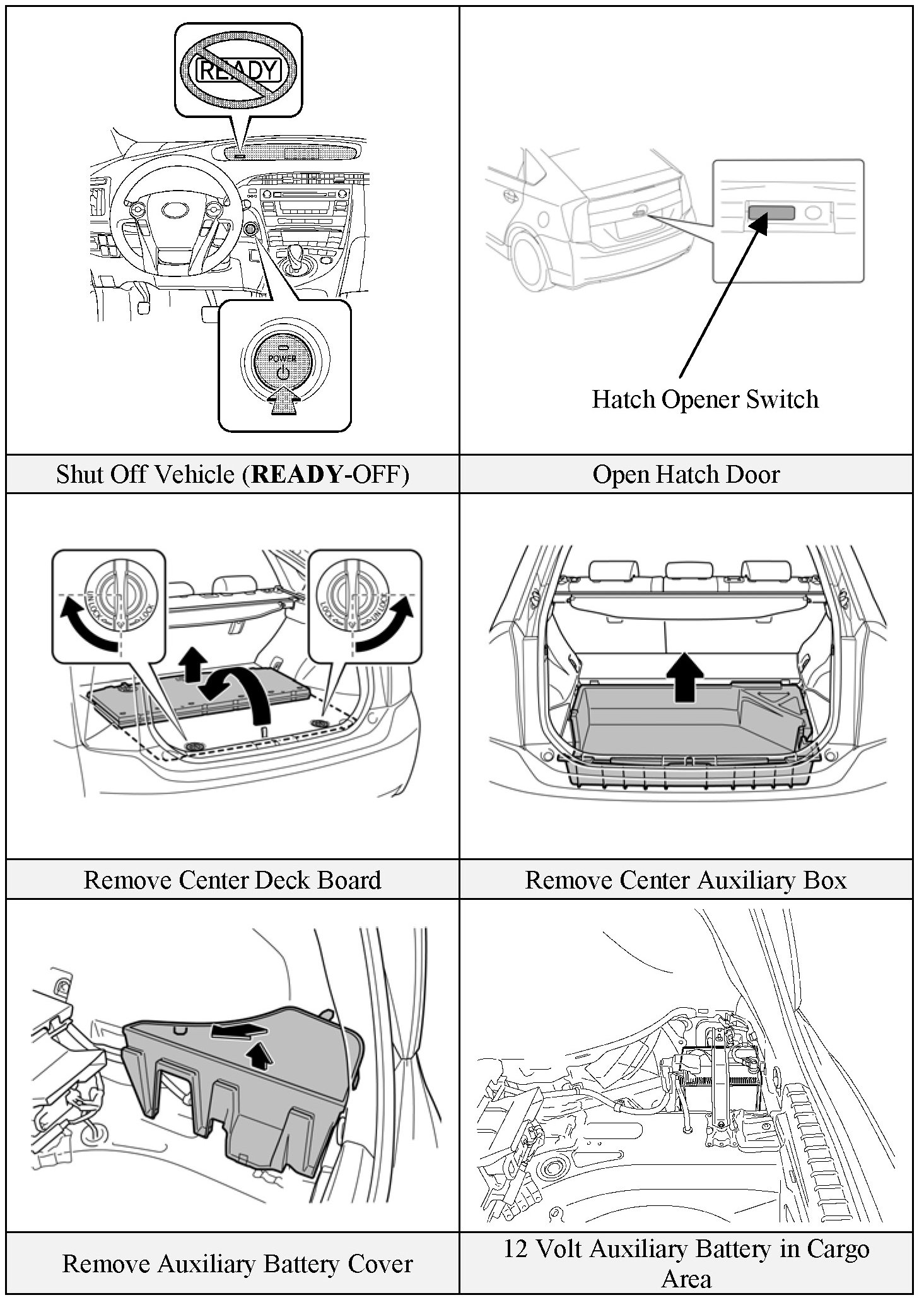 Before disconnecting the 12 Volt auxiliary battery, if necessary, lower the windows, unlock the doors and open the hatch as required. Once the 12 Volt auxiliary battery is disconnected, power controls will not operate.