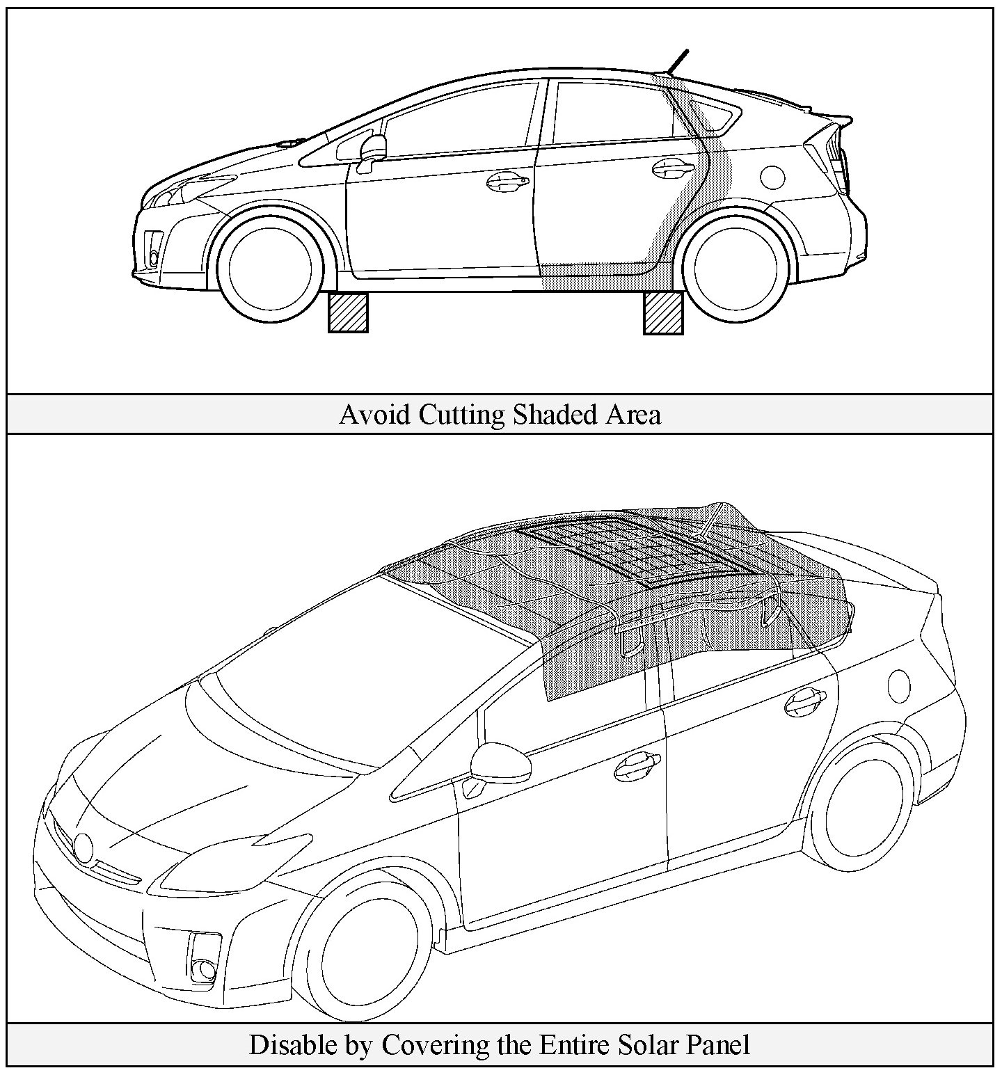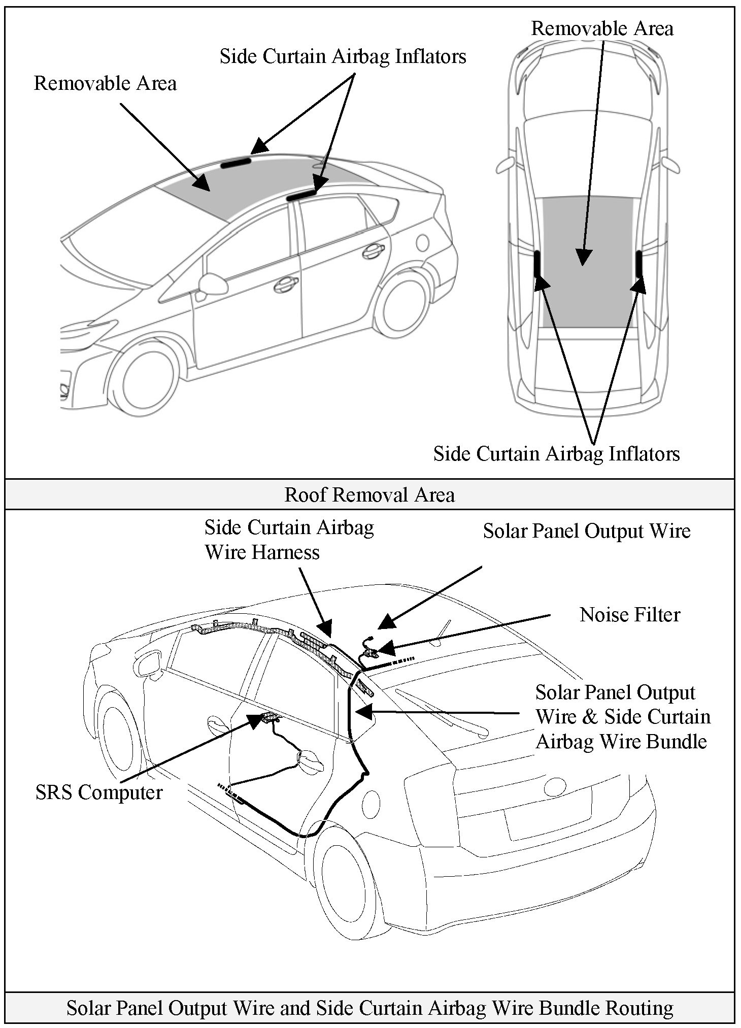 Prius models equipped with the optional solar panel have an output wire bundled with the side curtain airbag wire harness routed along the driver side C-pillar as shown in the illustration. This output wire is energized when the solar panel surface is exposed to light energy, and similar to a 12 Volt battery positive cable, it cannot be shut off or isolated until it reaches the control computer under the dashboard.