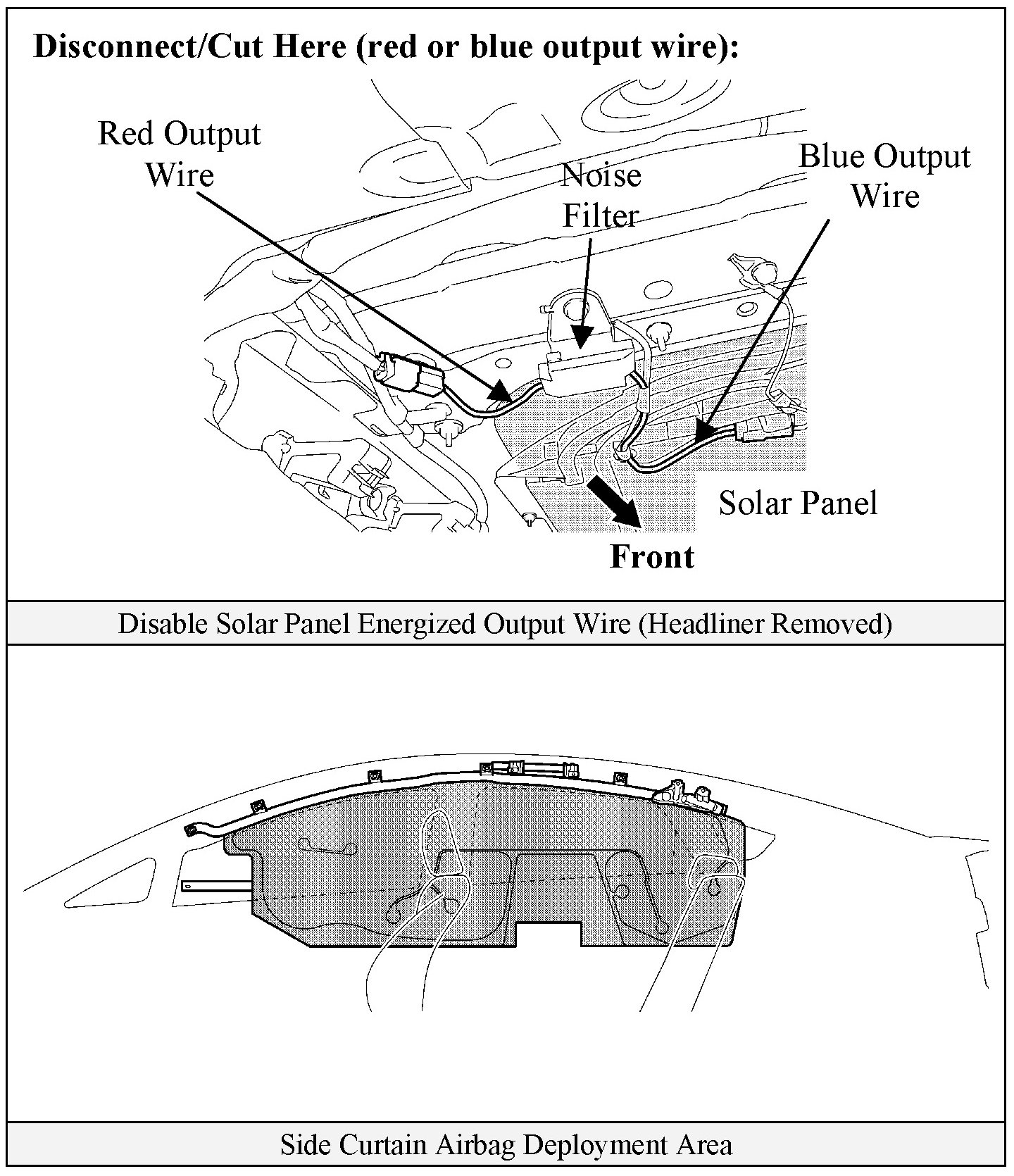 - Disable solar panel output by disconnecting or cutting the solar panel energized output wire. Remove the headliner above the driver side rear passenger area. Identify the red or blue output wire from under the solar panel as illustrated. Disconnect the connector or cut the red or blue wire to disable power output.