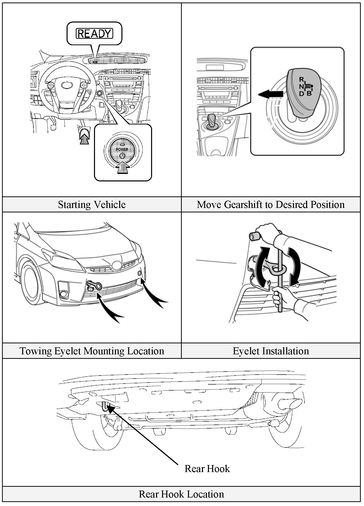 The Prius utilizes an electronic gearshift selector and an electronic P switch for park. If the 12-Volt auxiliary battery is discharged or disconnected, the vehicle cannot be started nor can it be shifted out of park. If discharged, the 12-Volt auxiliary battery can be jump started to allow vehicle starting and shifting out of park. Most other roadside assistance operations may be handled like conventional Toyota vehicles.
