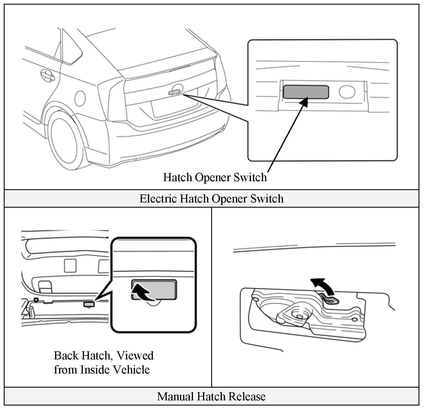 The Prius is equipped with an electric hatch opener. In the event of 12 volt power loss, the hatch cannot be opened from the outside of the vehicle.