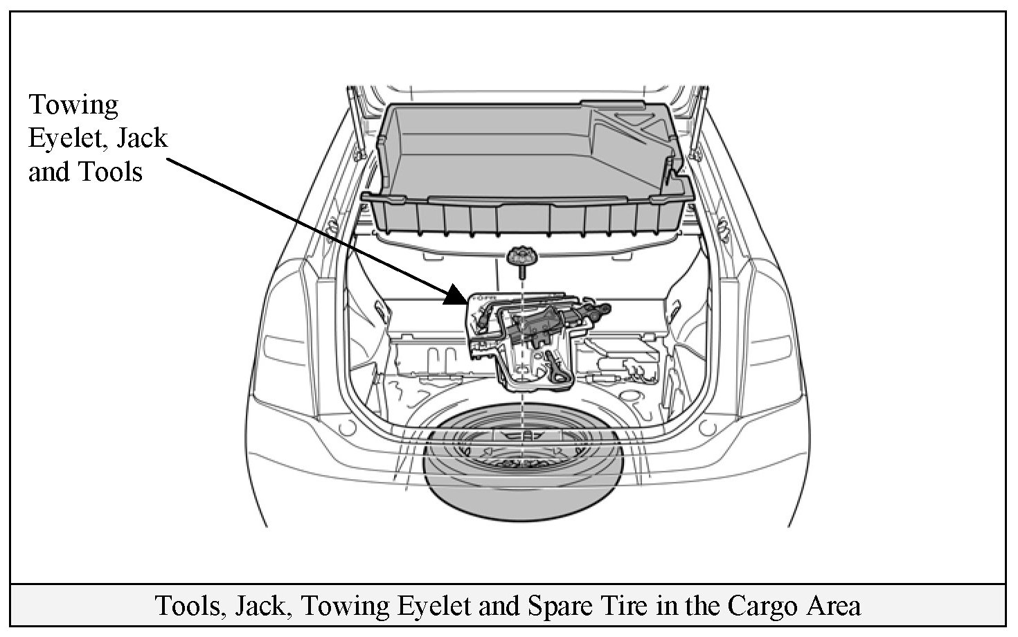 The jack, tools, towing eyelet and spare tire are provided as shown.