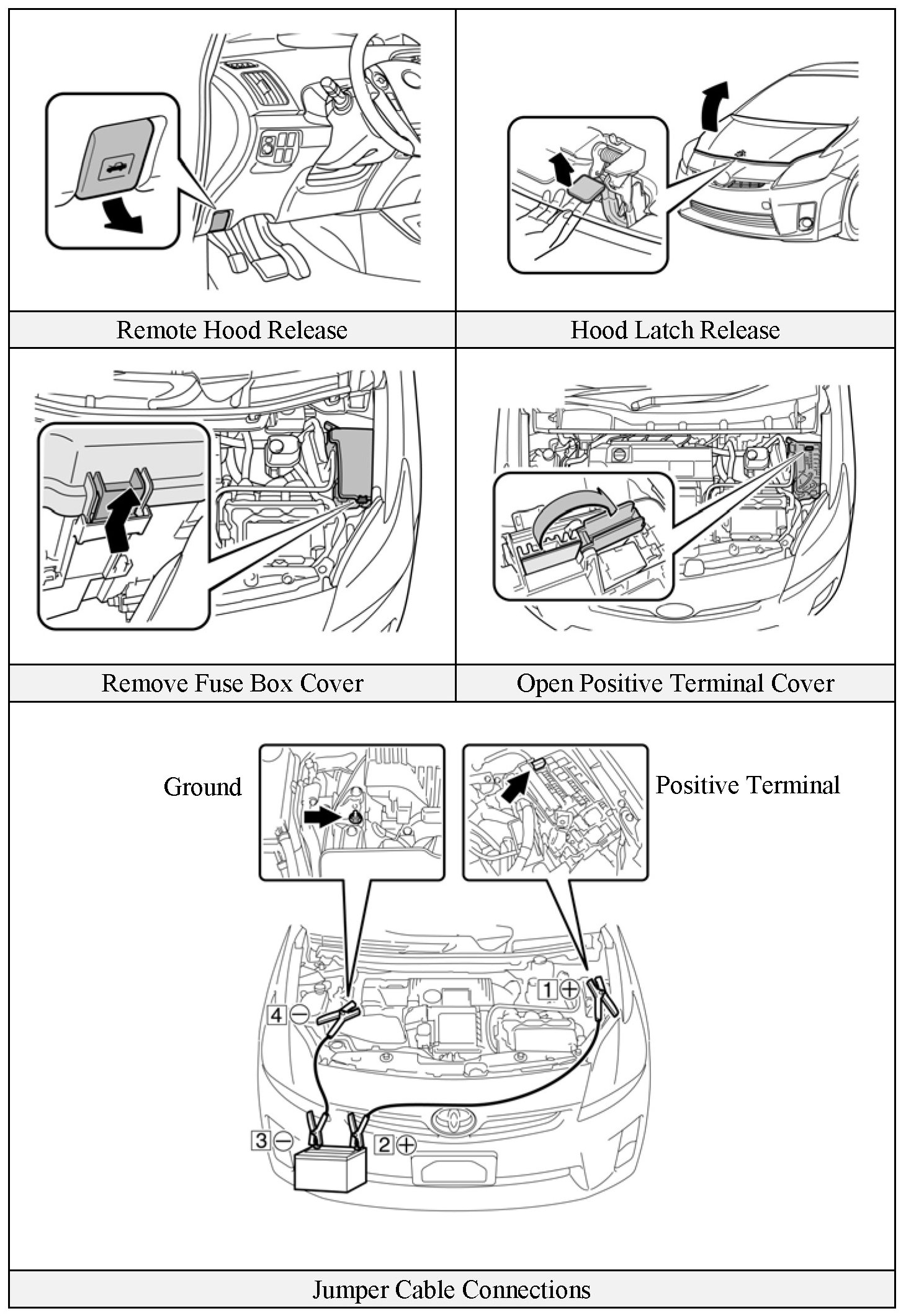 - Open the hood, remove the fuse box cover, and open the positive terminal cover.