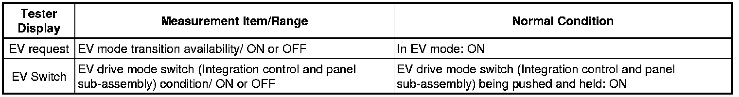 The EV mode signal is sent to the power management control ECU. This signal is then transmitted from the power management control ECU via CAN to the combination meter assembly to illuminate the EV indicator lamp.