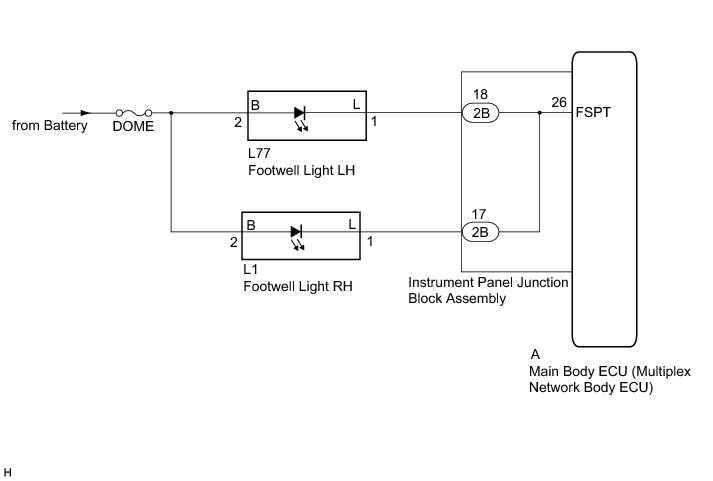 The main body ECU (multiplex network ECU) controls the footwell lights.