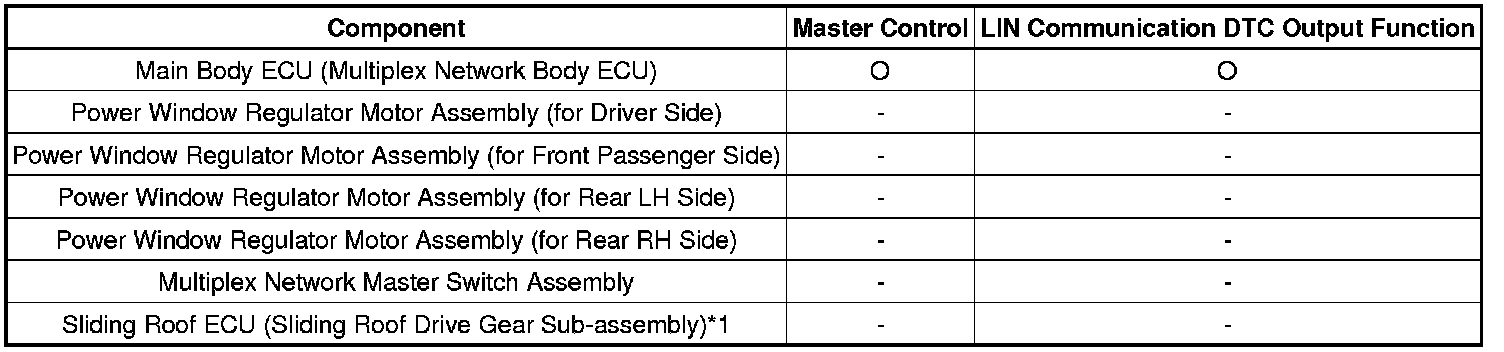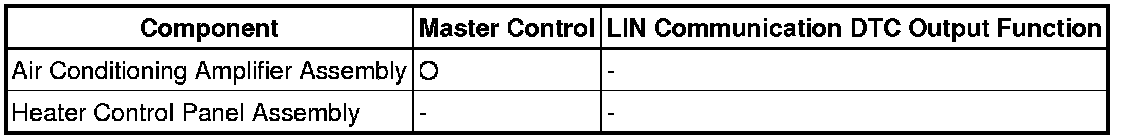 The LIN communication system is used for communication between the components in the tables below. If communication cannot be performed through LIN communication because of an open in the communication lines or other reasons, the master control ECU of the relevant system will store a DTC. Refer to the table below about the communication bus lines and connected components.