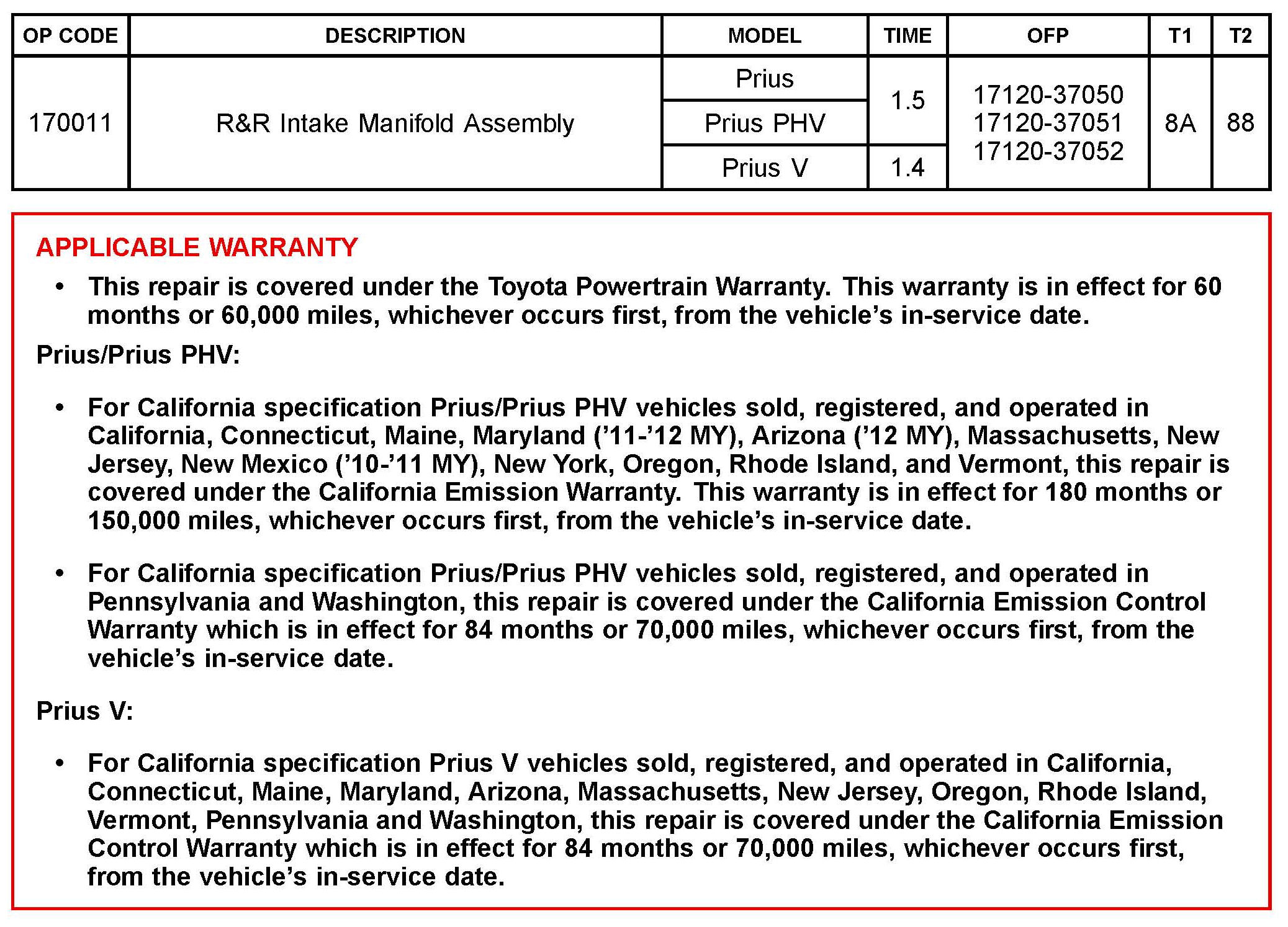 Some 2010-2012 vehicles equipped with a 2ZR-FXE engine may exhibit a MIL "ON" condition with Diagnostic Trouble Codes (DTCs) P2111 (Throttle Actuator Control System) and P0A0F (Engine Failed to Start) present when ambient temperatures are below 23°F/-5°C. The intake manifold assembly has been improved to help prevent this condition.