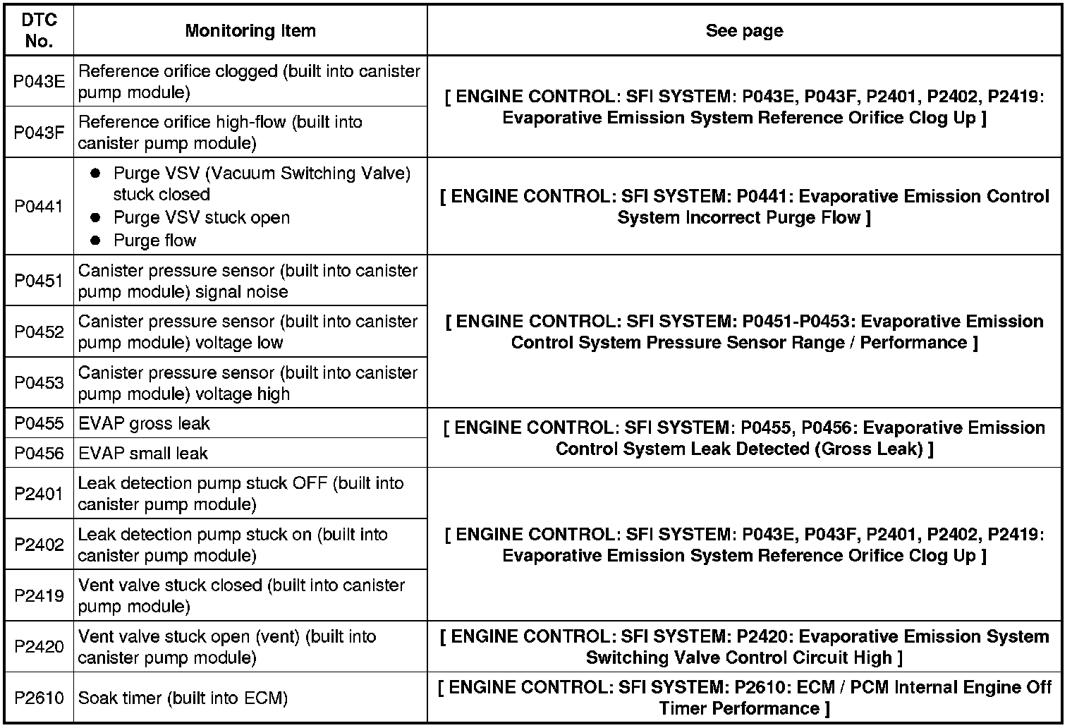If the reference pressure difference between the first and second checks is more than the specification, all the DTCs relating to the reference pressure (P043E, P043F, P0441, P0455, P0456, P2401, P2420) will all be stored.