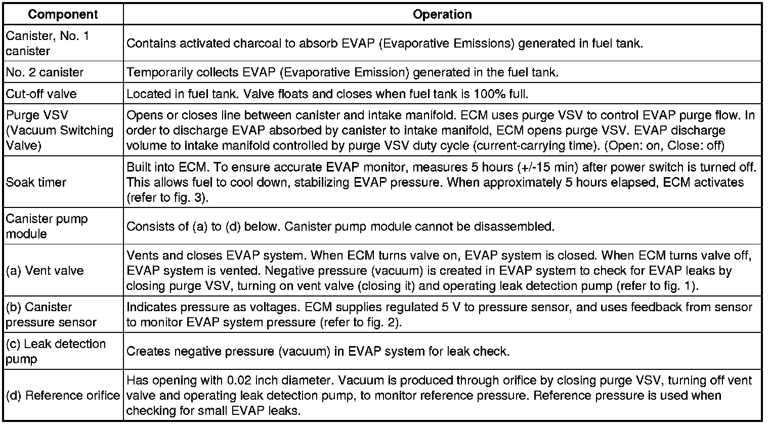 The leak detection pump creates negative pressure (vacuum) in the EVAP system and the pressure is measured. Finally, the ECM monitors for leaks from the EVAP system, and malfunctions in both the canister pump module and purge VSV based on the EVAP pressure.