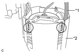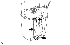 (c) Using a screwdriver with its tip wrapped in protective tape, disengage the 2 claws, and remove the fuel filter and fuel pump from the fuel sub-tank.