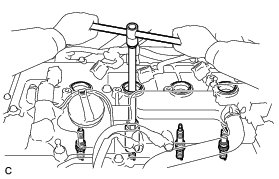 (a) Using a 14 mm spark plug wrench, install the 4 spark plugs.