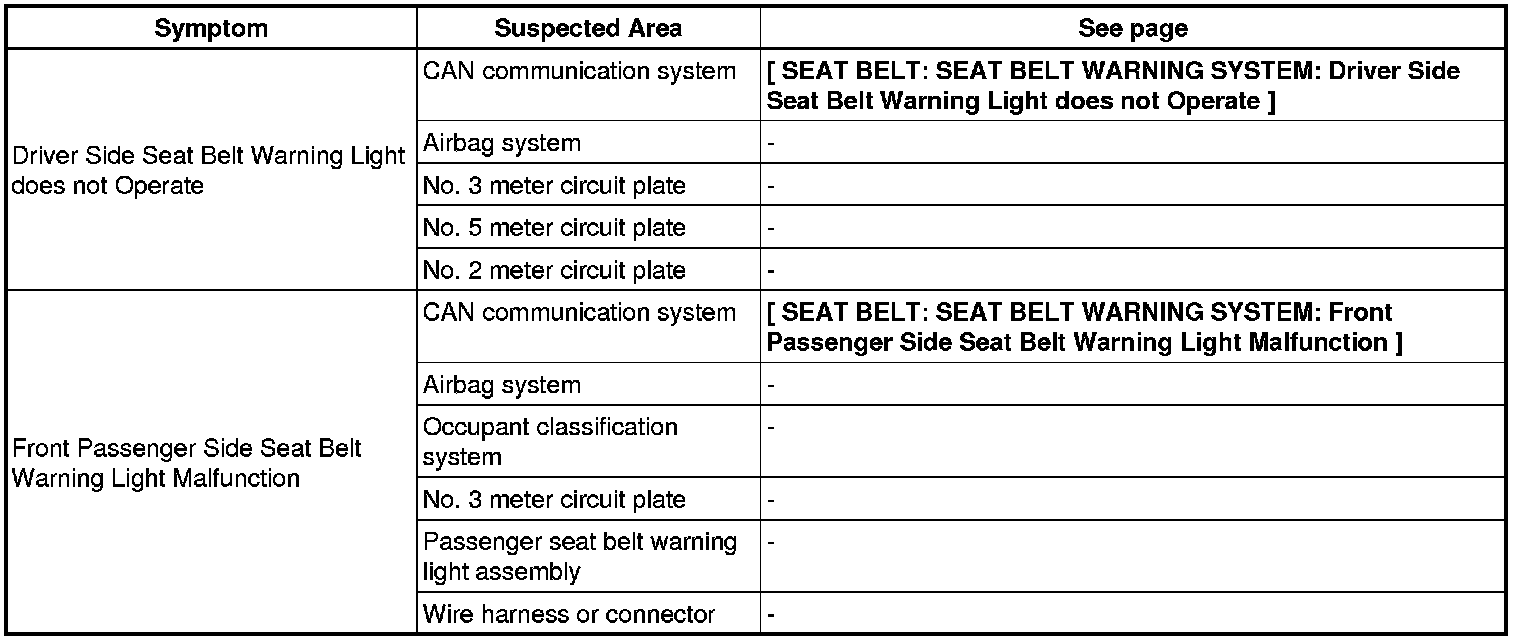 SEAT BELT: SEAT BELT WARNING SYSTEM: PROBLEM SYMPTOMS TABLE