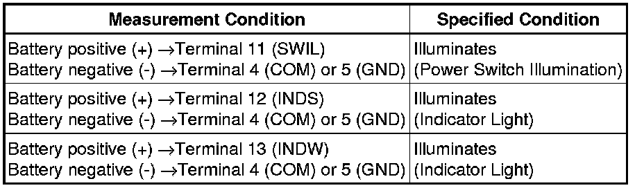 (b) Apply battery voltage between the terminals of the switch, and check the illumination condition of the power switch.