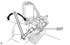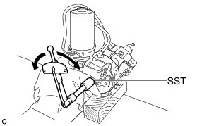 (d) Using SST, turn the steering main shaft once 180 degrees to the left and then 180 degrees to the right at a speed of 60 rpm, and repeat 2 to 3 times to adjust the axis centering of the power steering motor assembly.