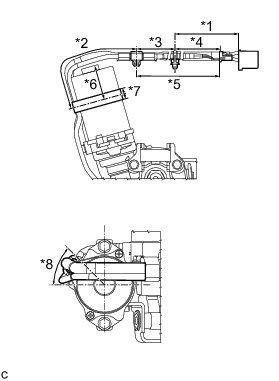 * Secure the wire harness to the power steering motor assembly within the range indicated by *8