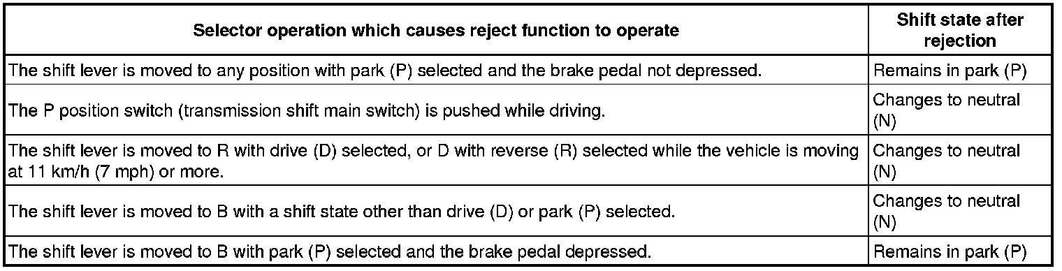 (a) In the electronic shift lever system, there may be a situation in which a shift state change cannot be done for safety reasons. When attempting to move the shift lever in such a situation, the system sounds a reject buzzer inside the meter and changes the shift state as shown in the following table.