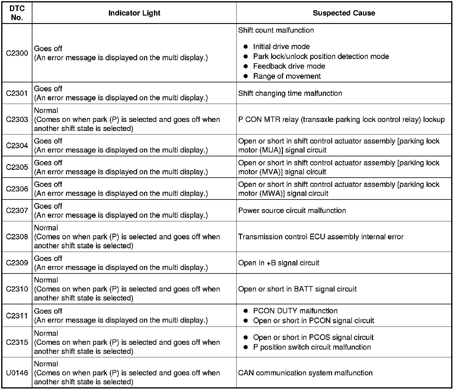 Even if the system has returned to normal, with park (P) selected, the indicator light does not return to normal without selecting a shift state other than park (P). (Normal refers to the indicator light coming on when park (P) is selected and going off when another shift state is selected.)