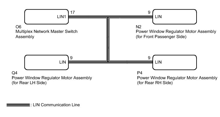 When the power switch is on (IG), the multiplex network master switch assembly sends remote up and down signals to each power window regulator motor assembly via the LIN communication line.
