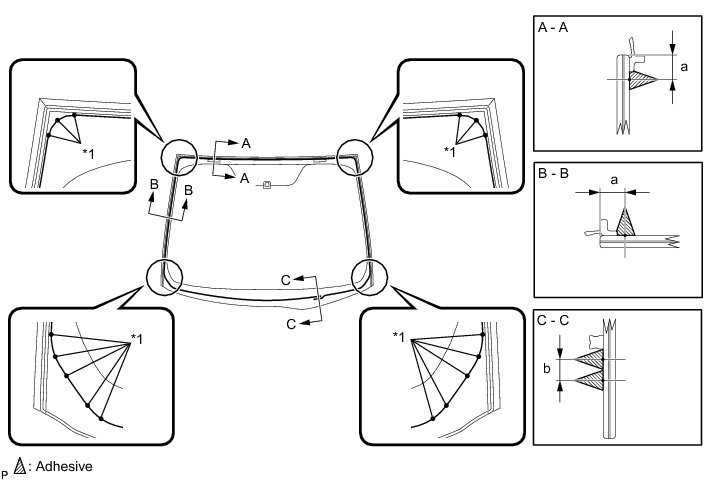 (b) Install the window glass adhesive dam onto the windshield glass, as shown in the illustration.