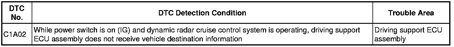 When the driving support ECU is replaced with a new one, it acquires the country specification information (destination, steering wheel position, etc.) from the main body ECU. When the country specification information in the driving support ECU assembly and main body ECU do not match, DTC C1A02 is output.