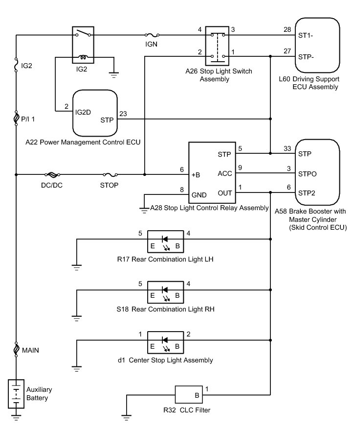 The brake booster with master cylinder (skid control ECU) receives a signal from the driving support ECU assembly and operates the brake actuator. The brake booster with master cylinder (skid control ECU) operates the brake actuator and at the same time illuminates the stop lights by operating the stop light control relay.