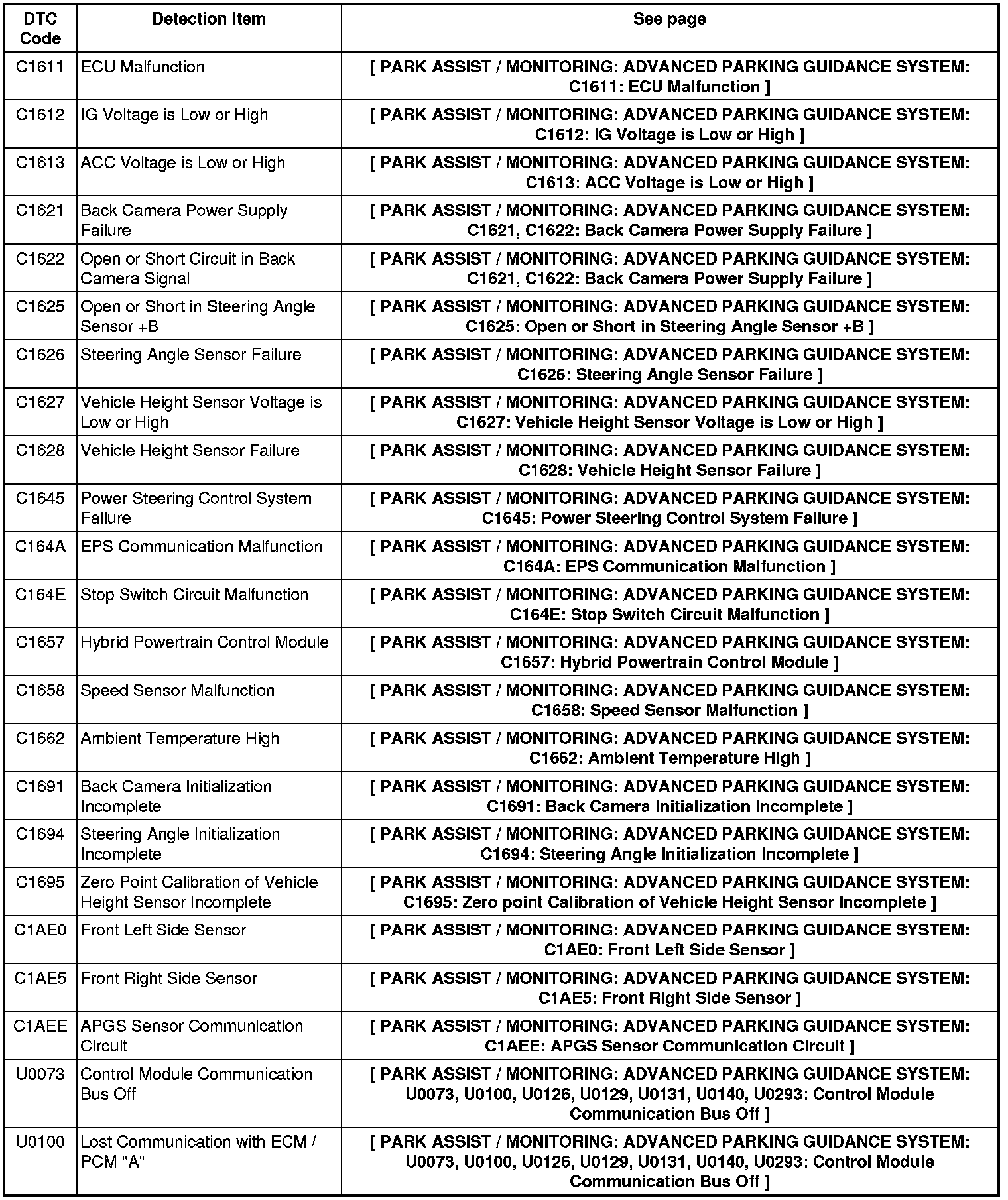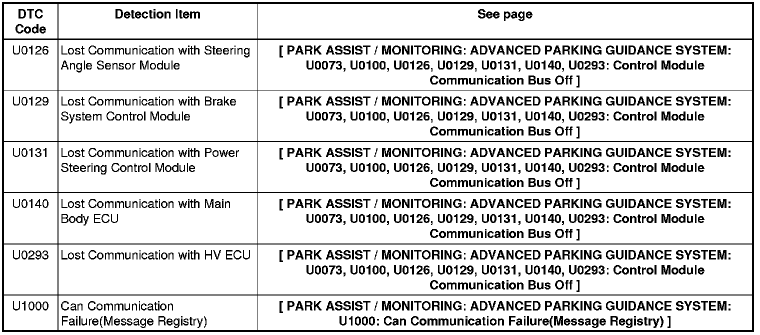 PARK ASSIST / MONITORING: ADVANCED PARKING GUIDANCE SYSTEM: DIAGNOSTIC TROUBLE CODE CHART