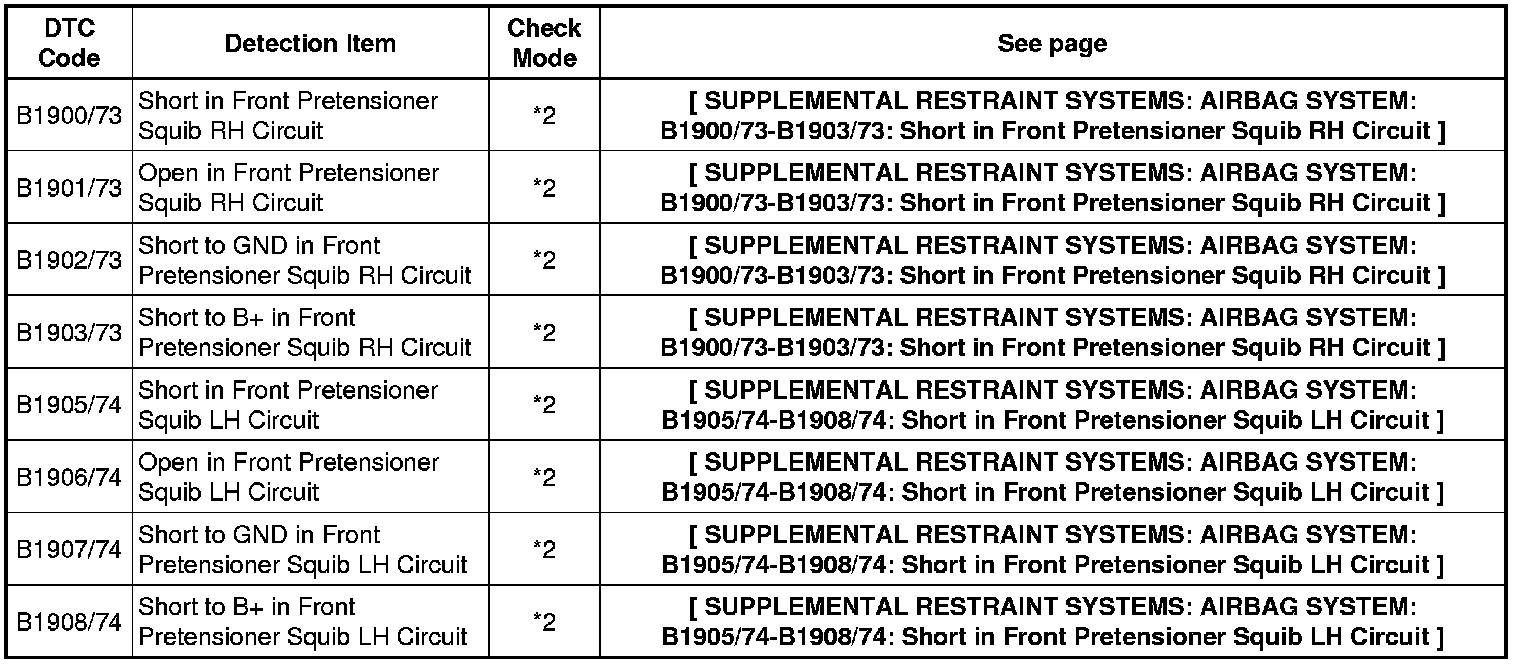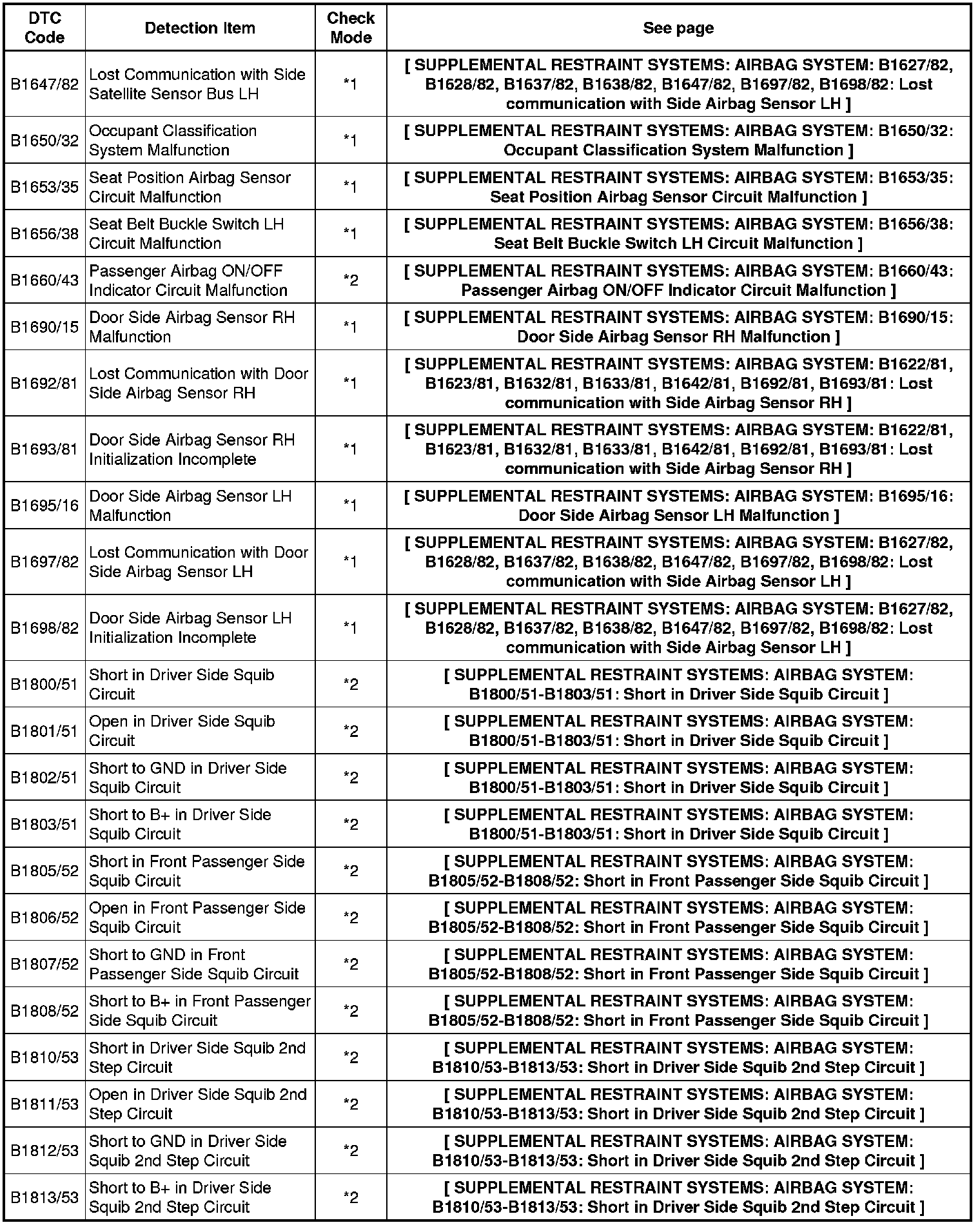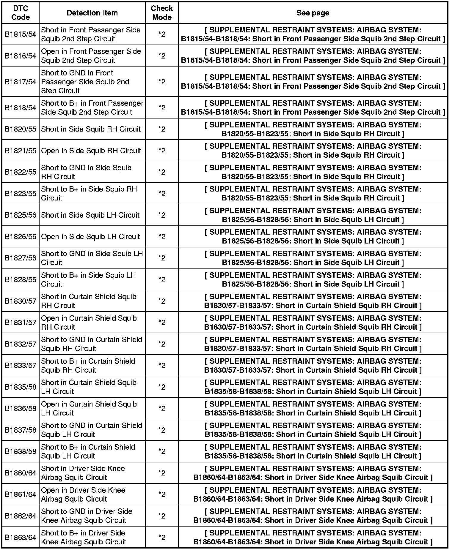 * In the case of any malfunction concerning an open circuit, short to ground, or short to B+ due to a squib, other trouble codes may not be detected. In this case, repair the malfunction currently indicated and then perform malfunction diagnosis again.