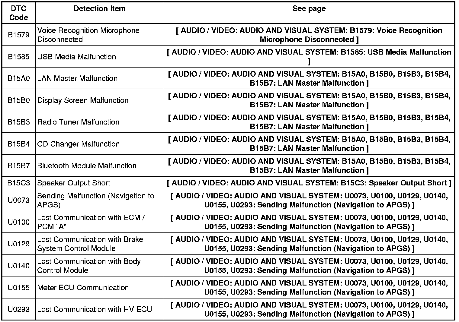AUDIO / VIDEO: AUDIO AND VISUAL SYSTEM: DIAGNOSTIC TROUBLE CODE CHART
