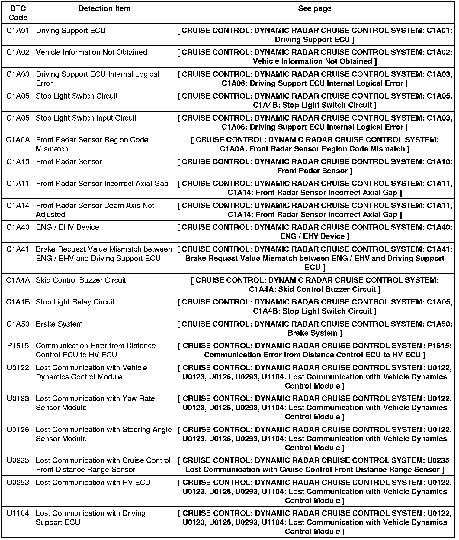 CRUISE CONTROL: DYNAMIC RADAR CRUISE CONTROL SYSTEM: DIAGNOSTIC TROUBLE CODE CHART