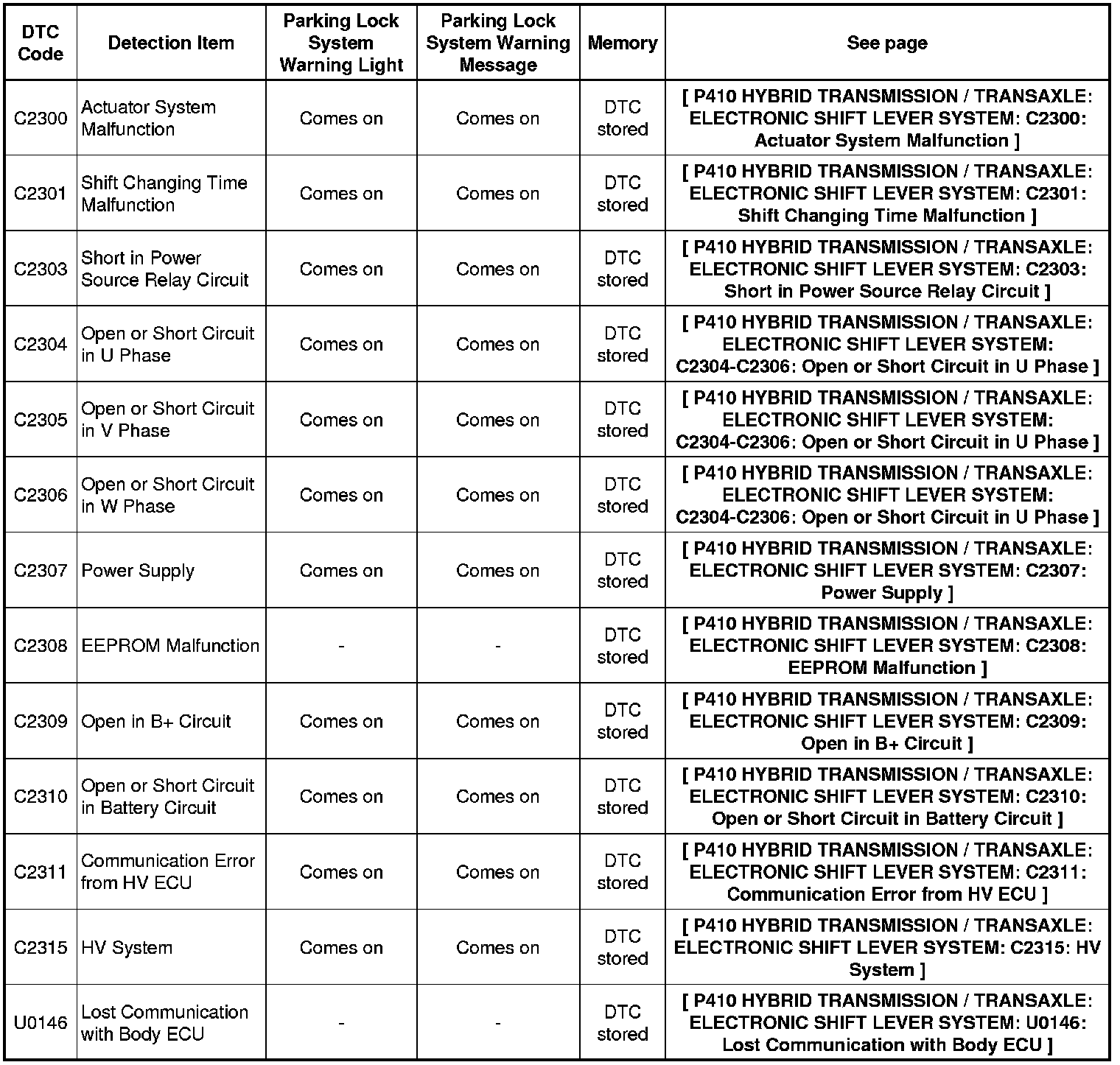 P410 HYBRID TRANSMISSION / TRANSAXLE: ELECTRONIC SHIFT LEVER SYSTEM: DIAGNOSTIC TROUBLE CODE CHART